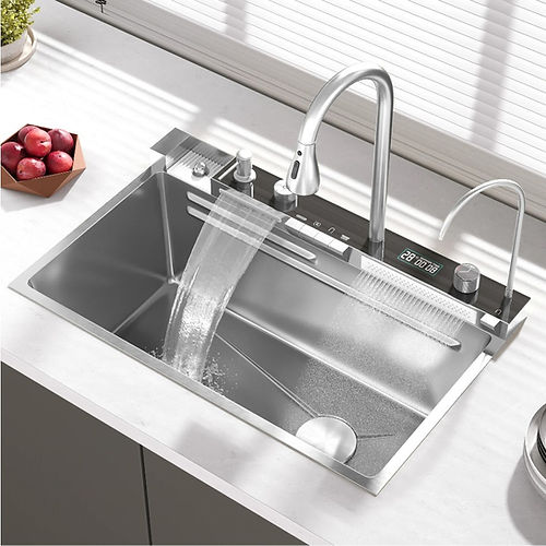 RUMO Multifunctional Nano Sink With Digital Display and flick buttons to control water dispense. It is the perfect addition to any modern kitchen. Made from 1.0 mm thick durable 304 stainless steel, this sink is built to last. The Nanotech ceramic coating along with honeycomb embossing gives it an elegant finish, while also making it scratch proof and anti-static, making it easy to clean. The waterfall tap with 4 function water dispense head provides versatility for a variety of uses. The sink also includes a secondary bowl, strainer basket, and other accessories to make it the ultimate multifunctional sink for your kitchen.